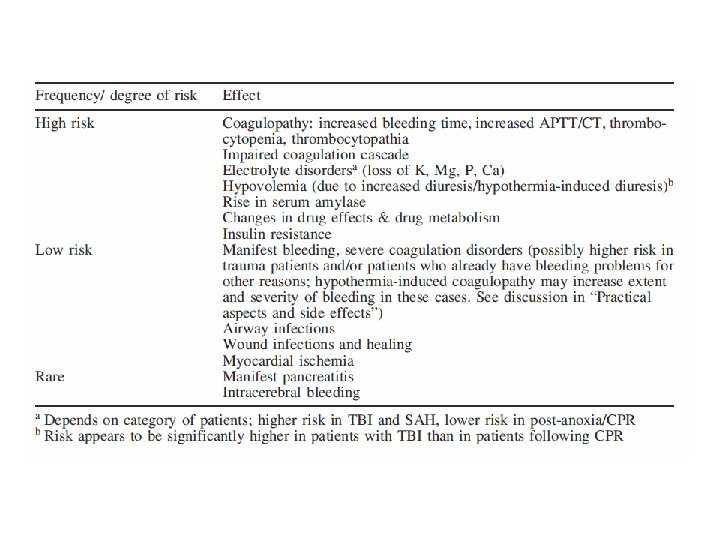 Complications of Cooling • Hypovolemia (hypothermia induced diuresis) • Coagulopathy (impaired coagulation cascade and thrombocytopenia) • Electrolyte disorders (hypothermia induced diuresis, K, Mg, Ca) • Insulin resistance • Changes in drugs effects and metabolism (altered clearance of fentanyl, midazolam, and atracurium)