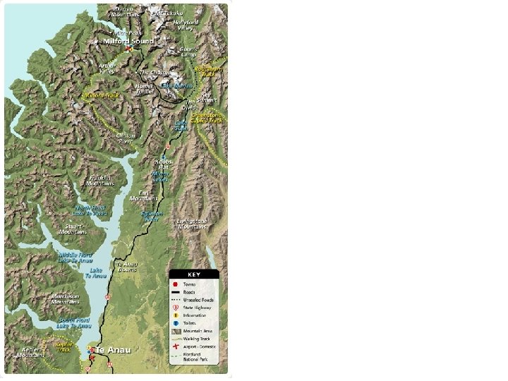 Fiordland Link Experience • combine a number of innovative transport options into one trip that includes • A 20 km trip in a 25 -m catamarans (240 capacity) across Lake Wakatipu to Mt Nicholas station • Followed by a 45 km trip in an all-terrain coach on balloon tyres to the Kiwi Burn swing bridge terminal • Followed by a 41 km 35 minute monorail and mountain bike track through the beech forest of the Snowdon Forest Conservation Area connecting to Te Anau Downs • joining up with a bus park and ride facility on the existing road to Milford Sound