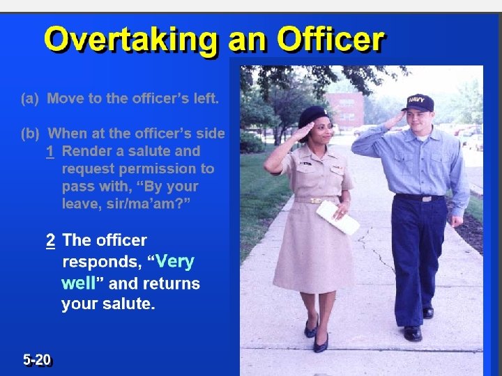 When it is necessary to pass a senior officer, the junior officer or cadet salutes when abreast and asks, “By your leave Sir/Ma’am? ” The officer will return your salute. You need not stop or wait for "Carry on" when doing this. Overtake to the port (left) side of the officer so your salute is visible.