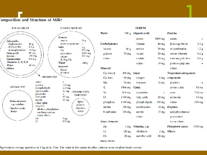 Properties of the main structural elements of milk fat casein micelles Casein, water salts globular proteins Serum proteins lipoprotein paricles Main component(s) Fat Lipids, proteins To be considered as Emulsion Fine dispersion Colloidal solution Colloidal dispersion Content (% dry matter) 4 2. 8 0. 6 0. 01 Volume fraction 0. 04 0. 1 0. 006 10 -4 Particle diameter 0. 1 – 10 m 20 – 300 nm 3 – 6 nm 10 nm Number per ml 1010 1014 1017 1014 Surface area (cm 2/ml milk) 700 40. 000 50. 000 100 Density (20 0 C; kg/m 3) 900 1100 1300 1100 Diffusion rate (mm in 1 h) 0. 0 0. 1 – 0. 3 0. 6 0. 4 Isoelectric p. H ~3. 8 ~4. 6 4– 5 ~4