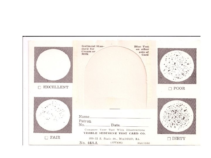 Sediment test • In clean dry beaker add 50 gm M. P +500 ml D. W Shaking Filter the content through cotton wool pad disc Result Disc is dried and compared with standard disc to determine grade of milk powder