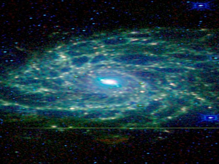 GALAXY SHAPES 1. Spiral Galaxies � viewed from above: looks like a pinwheel with long “arms” spiralling out from the core � viewed from the side: looks like a paper plate with an orange at its centre � central bulge made up of stars � the circling disk is made up of gas, dust, and newly forming stars � “halo”: the glow surrounding the galaxy