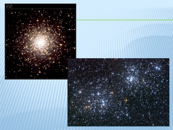 � Star clusters: distinct formations of stars � There are 2 types of star clusters: �Globular Clusters: composed of as many as 1 million stars and held together by mutual gravity in a spherical shape �Open Clusters: contain anywhere from a few hundred to a few tens of thousands of stars