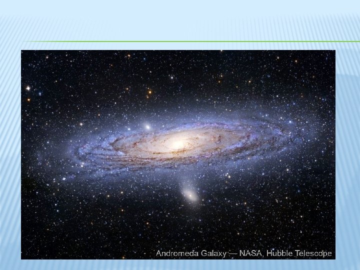 HOW MANY GALAXIES ARE IN THE UNIVERSE? � Used to believe there was only 1 galaxy � Nebula: a cloud of gas and dust � 1925: Hubble thought he was looking at a nebula, but realized it was actually a huge collection of starts � now known as the Andromeda Galaxy � our nearest neighbouring galaxy � Astronomers estimate that the whole universe contains at least 125 billion galaxies