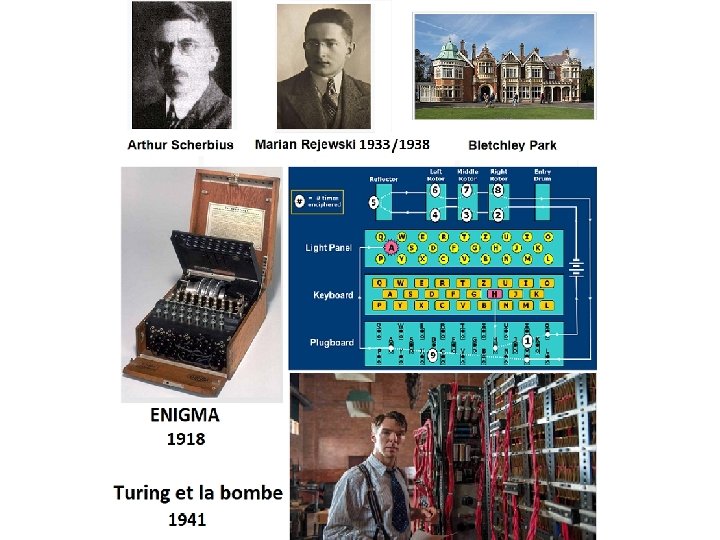 Enigma et ULTRA • Enigma (commerciale) décryptée par les mathématiciens polonais fin 1932, en particulier par Marian Rejewski, Jerzy Różycki et Henryk Zygalski. En 1937, les français récupèrent les secrets d’Enigma (espionnage, achat). • Août 1939, déplacement des experts et des matériels (Pol. Fra. Ang. ) à Bletchey Park, 12. 000 personnes. Direction : Alan Turing. Construction d’une machine à décrypter : « La bombe » . A partir de 1941, nom de code de cette organisation et de ses techniques : ULTRA. • Une difficulté : 1 février 1942, changement de cryptage allemand. 11 mois pour décrypter. • 18. 000 messages décryptés par jour!