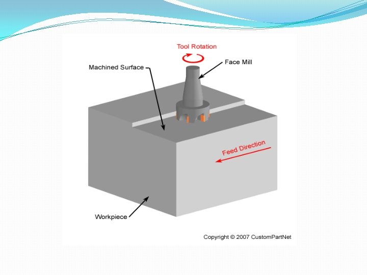v Face Milling �A cutting process that uses a mill to cut a flat surface by positioning the tool at a right angle to the work piece.