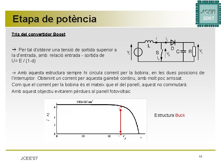 Etapa de potència Tria del convertidor Boost Per tal d’obtenir una tensió de sortida superior a la d’entrada, amb relació entrada - sortida de U= E / (1 -d) Amb aquesta estructura sempre hi circula corrent per la bobina, en les dues posicions de l’interruptor. Obtenint un corrent per aquesta gairebé continu, amb molt poc arrissat. Com que el corrent per la bobina és el mateix que el del panell, aquest no commutarà. Amb aquest objectiu evitarem pèrdues al panell fotovoltaic Estructura Buck JCEE’ 07 11