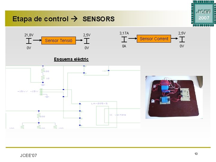 Etapa de control SENSORS 21, 8 V 2, 5 V 3, 17 A 0 V 0 A Sensor Corrent Sensor Tensió 0 V 2, 5 V 0 V Esquema elèctric JCEE’ 07 13