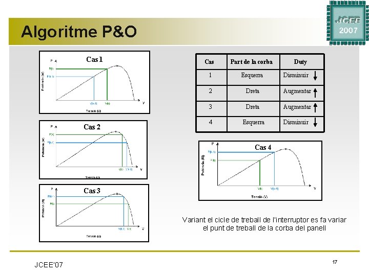 Algorisme de control Diferents mètodes de control MPPT • Pertorbació i observació (P&O) • Conductància incremental (Inc. Cond) • Voltatge constant (CV) Pertorbació i observació (P&O) • Fàcil implementació • Eficient, per una meteorologia poc variable com la nostra • Aquest mètode de control és una base per molts algorismes més complexes. JCEE’ 07 16