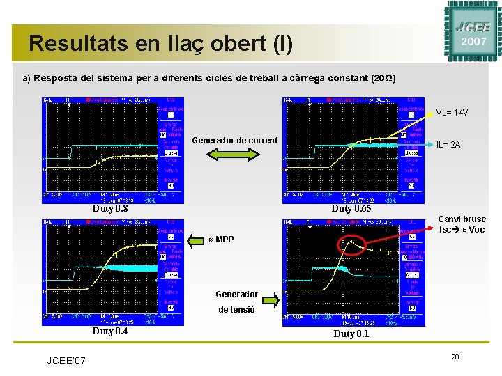 Resultats en llaç obert L’objectiu del muntatge experimental amb llaç obert, es verificar el correcte funcionament del circuit de potència. DC Càrrega PV DC PWM Sistema en llaç obert JCEE’ 07 19