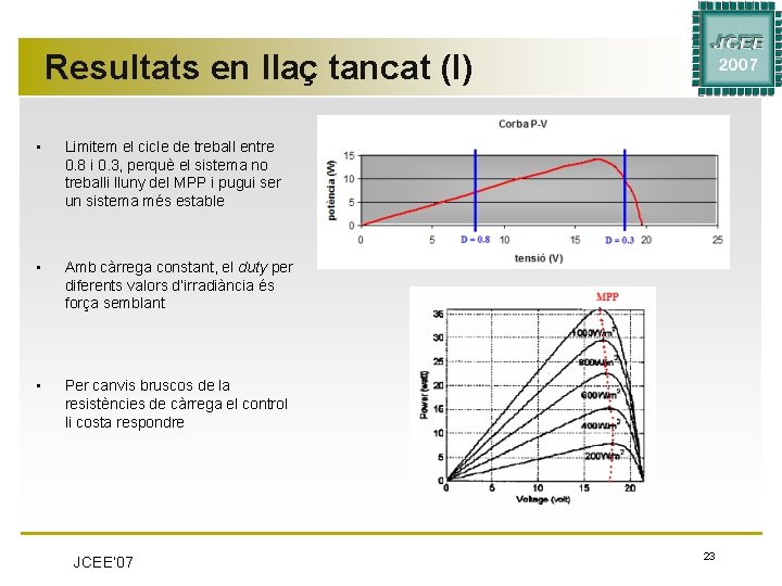 Resultats en llaç obert (III) • Com podem observar en les gràfiques anteriors no tenim el control que ens garantitzi el MPPT del panell, ja que si mantenim una de les dues variables constant (càrrega o duty) variem la potència lliurada del panell. JCEE’ 07 22