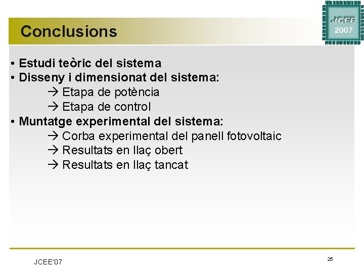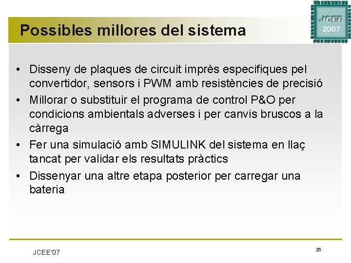 Conclusions • Estudi teòric del sistema • Disseny i dimensionat del sistema: Etapa de potència Etapa de control • Muntatge experimental del sistema: Corba experimental del panell fotovoltaic Resultats en llaç obert Resultats en llaç tancat JCEE’ 07 25