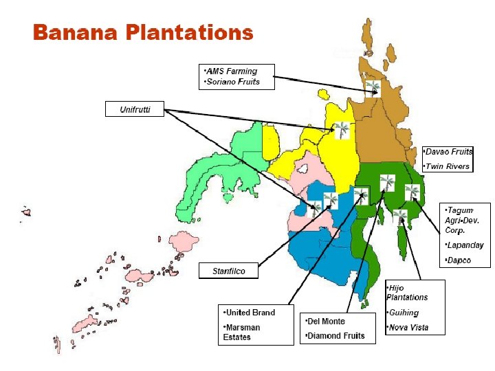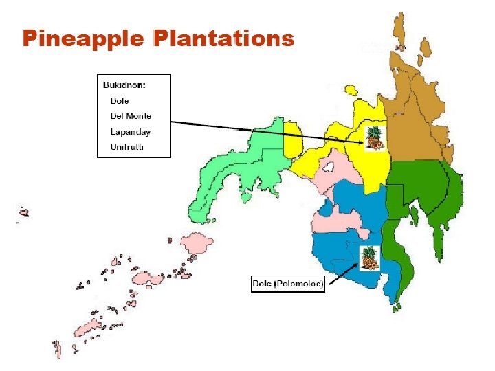 Pineapple plantations in Northern Mindanao Kompanya Ektarya Lugar Dole Philippines 36, 204 Dangcagan ug Kibawe, Bukidnon Del Monte Philippines 4, 019. 28 Malaybalay, Impasugong, Sumilao DAVCO 1, 500 Don Carlos Southern Fresh Products 1, 500 Don Carlos Dole-STANFILCO 1, 300 Malaybalay, Impasugong, Kitaotao, Baungon Lapanday Diversified Products 900 Manolo Fortich, Malaybalay TOTAL 45, 423. 28