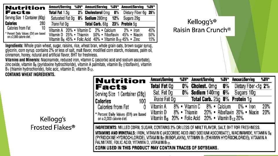 Label Reading Remember 3 g or less saturated fat 0 g trans fat Partially hydrogenated oils? 140 mg sodium 3 grams or mote fiber # of sugars 1 st ingredient whole grain? Types of fat