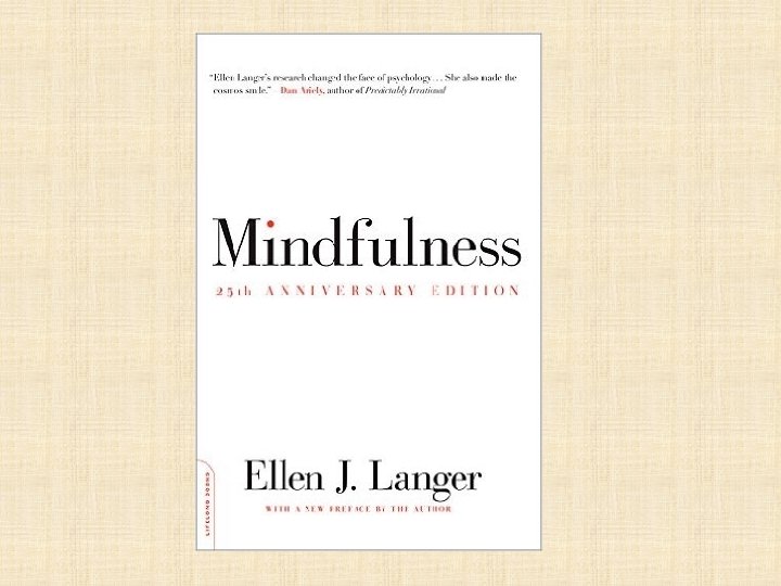 Ellen Langers- Mindfulness • Why there is lack of cognitive processing of stimuli leading to emotions determining our behaviour ? • Mindfulness : as the process of drawing novel distinctions. – Key attributes : creation of new categories, openness to new information, awareness of more than one perspective • The goal of the mindful perspective to increase – cognitive flexibility, – behavioural flexibility – the ability to adapt to one’s current environment in a meaningful manner.