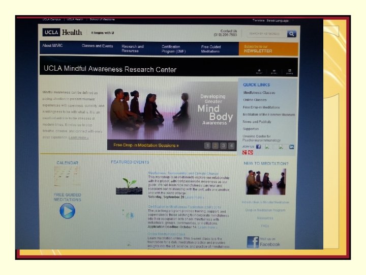 Mindfulness in Colleges and Universities • Mindfulness Based Stress Reduction - Mindful Living Programs Umass • University of Minnesota Mindfulness club • Oxford Mindfulness Centre • Center for Mindfulness - the University of Massachusetts Medical. . . • UCLA Mindful Awareness Research Center • Mindfulness Meditation Course - Stanford Hospital & Clinics. . . • Mindfulness Programs - University of Iowa Hospitals and Clinics • Center for Mindfulness at UC San Diego Health System • Guided Mindfulness Practices - University of Missouri System http: //www. mindfulnet. org/page 7. htm • UVA Mindfulness Center - School of Medicine - University of
