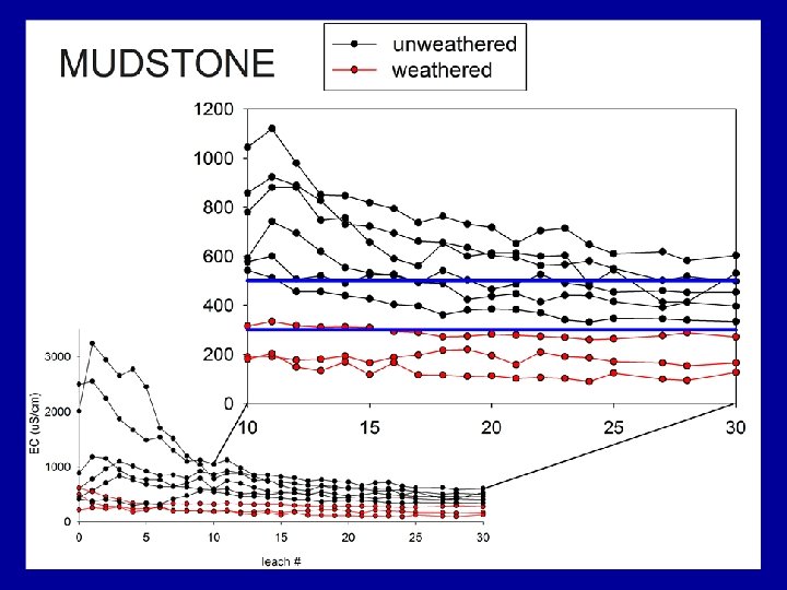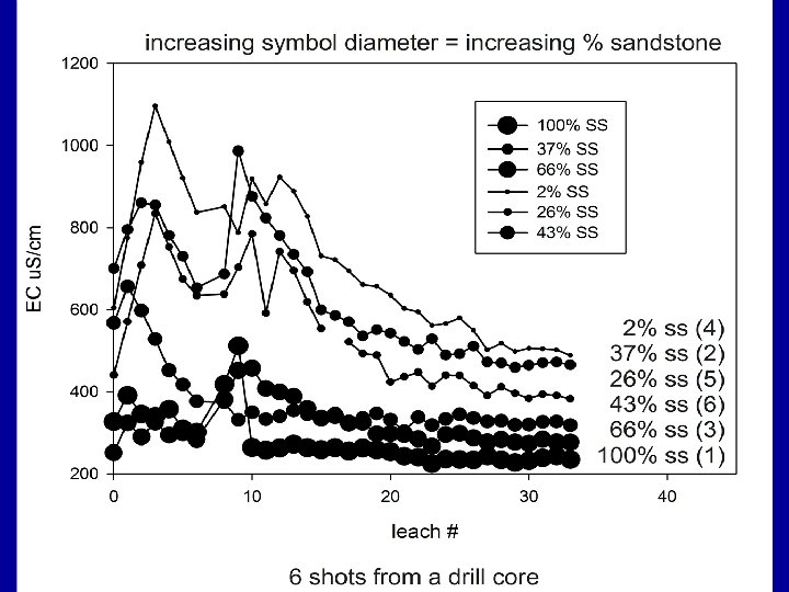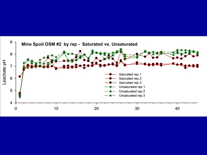 Summary Findings Most samples eluted considerable levels of TDS over their initial leaching cycles with EC usually > 500 u. S/cm; some were lower. For all materials, after first pore volumes (7 to 9 cycles) leach, TDS elution drops rapidly. Samples containing significant reactive sulfides were most likely to elute high TDS levels for the duration of the study, regardless of their leachate p. H values.