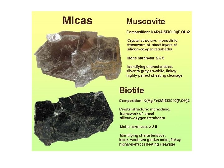 Non-silicate Minerals rock salt—a rock dominantly composed of sodium chloride (Na. Cl - the mineral halite). Rock salt is an evaporite formed in restricted basins with an inflow of seawater located in an arid environmental setting. gypsum—a mineral composed of hydrous calcium sulfate (Ca. SO 4 -2 H 2 O); an evaporite mineral used in the manufacture of plaster. calcite—a common rock-forming mineral consisting of calcium carbonate—Ca. CO 3. Calcite can be white, colorless (transparent), or slightly colored, commonly yellow, by other inclusion of traces of other elements. Calcite is a major constituent of sedimentary rocks such as limestone, chalk, and travertine, and in the metamorphic rock form, marble. dolomite—A white or light-colored mineral, essentially Ca. Mg(CO 3)2, commonly found in association with limestone or marble. Dolomite is a common replacement mineral in limestone that has been exposed the high magnesium content brine fluids. hematite—A reddish, steel gray, or black mineral consisting of ferric oxide (Fe 2 O 3). limonite—An amorphous orange to brownish mineral consisting of a mixture of hydrated ferric oxides, important as an iron ore. Rust on iron vehicles is essentially limonite. magnetite—a gray-black magnetic mineral that consists of iron oxide (Fe 3 O 4) and is an important form of iron ore. pyrite—a brass-colored mineral, Fe. S 2, occurring widely and used as an iron ore and in producing sulfur dioxide for sulfuric acid. Also called fool's gold, iron pyrites