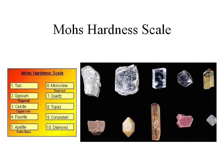Mohs Hardness Scale Talc 2 Gypsum 3 Calcite 4 Fluorite 5 Apatite 6 Potassium feldspar 7 Quartz 8 Topaz 9 Corundum 10 Diamond 1 Softest Hardest