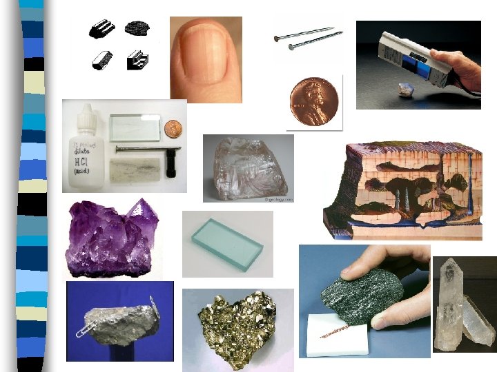 D. Identification Tests n 1. Hardness n 2. Streak (True Color) n 3. Acid Test – Use hydrochloric acid – Tests for carbonate (calcite)
