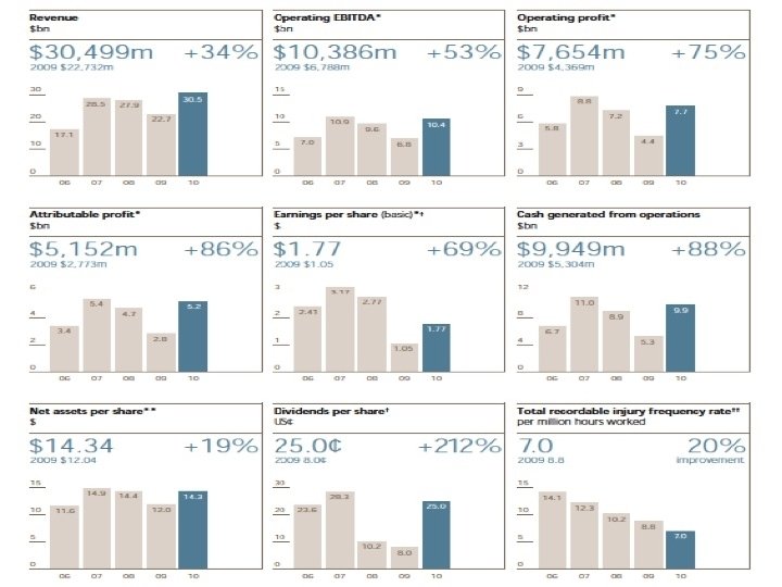 Operational Highlights 20 major expansions and new mines currently in construction, including 10 projects approved during 2010 Three major new mines successfully commissioned: Nickel Rim South, Goedgevonden, and Blakefield South 20% annual reduction in total recordable injury frequency rate; sector leader in the Dow Jones Sustainability Index for the 4 th year running
