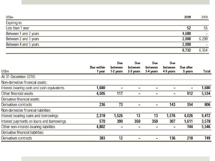 Liquidity risk The risk that the Group may not be able to settle or meet its obligations on time or at a reasonable price Utilizing both short and long term cash flow forecast to manage the risk Using S&P (BBB) and Moody’s (Baa 2) to assess the ongoing credit-worthiness