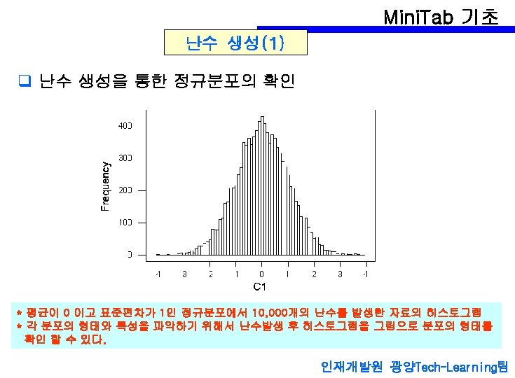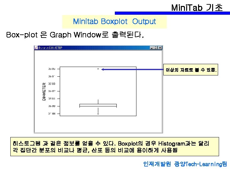 Mini. Tab 기초 Minitab Histogram Output Histogram은 Graph Window로 출력된다. 이상치 자료로 볼 수 있음. 인재개발원 광양Tech-Learning팀