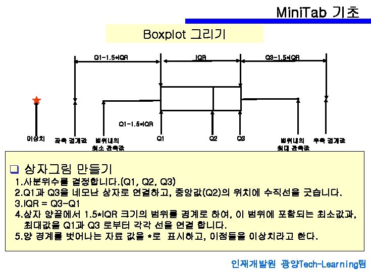 Mini. Tab 기초 Minitab Stem-And-Lea. F Output q Stem-And-Lea. F 는 Session Window로 출력된다. Minitab Output Trim Outliers를 선택한 경우 이상치 자료로 볼수 있음 줄기 인재개발원 광양Tech-Learning팀