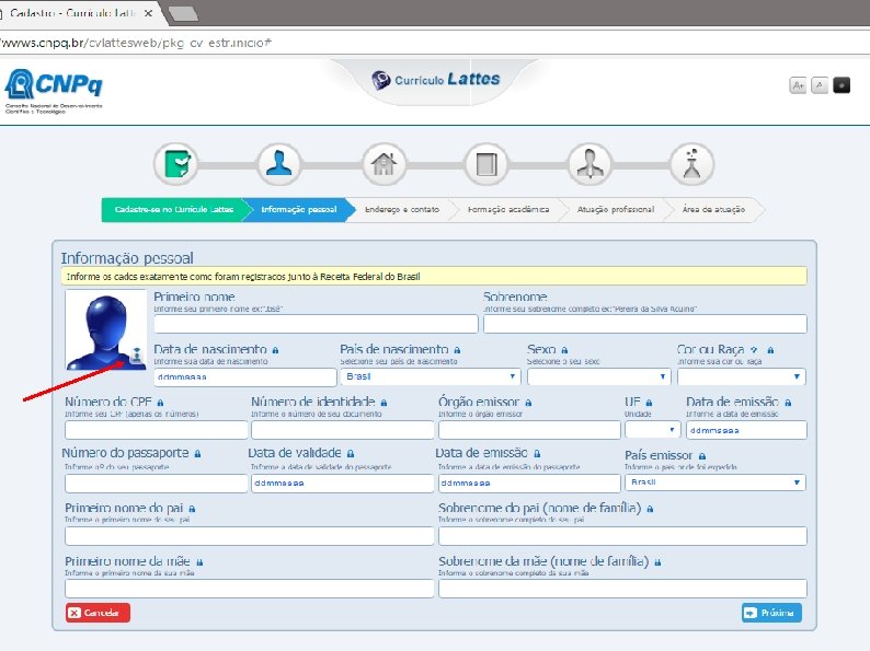 Para cadastrar seu currículo, preencha todas as informações solicitadas. Atente-se que, na aba Informação Pessoal, os dados devem estar em conformidade com os dados cadastrados na Receita Federal, por isso, é importante que possua em mãos o seu RG e CPF. Os dados referentes ao Passaporte não são obrigatórios para o cadastro do currículo. Para alterar a foto, basta clicar no ícone ao canto inferior da mesma e efetuar o upload de uma foto salva em seu computador.