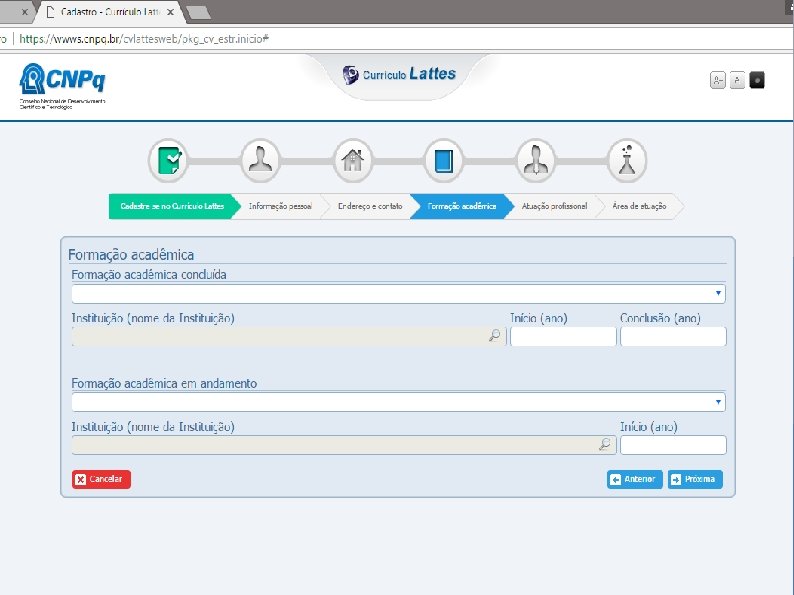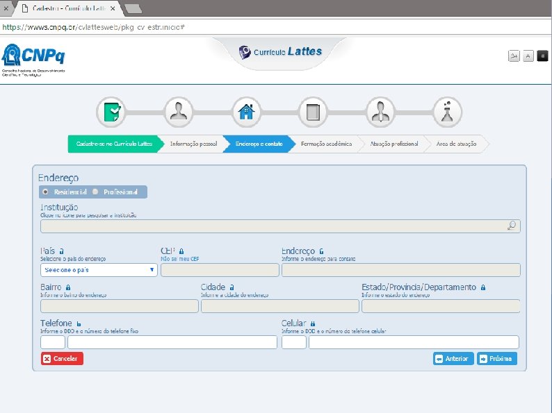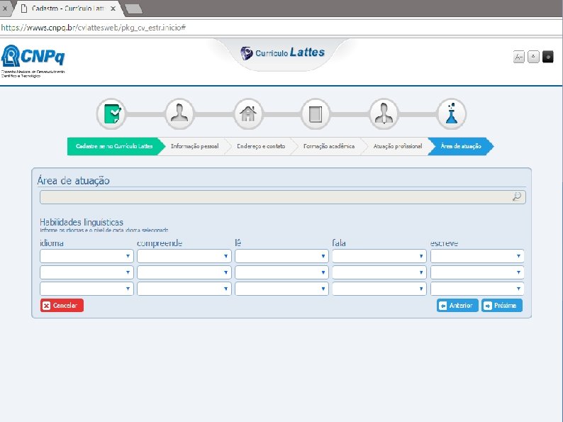 Na aba Endereço e Contato, deverá ser informado um endereço para contato; Na aba Formação Acadêmica é possível cadastrar toda a sua formação, desde o Ensino Fundamental até o Doutorado; Na aba Atuação Profissional é possível informar todos os vínculos empregatícios do usuário, mesmo de períodos anteriores ao cadastro do currículo; Na aba Áreas de Atuação, você pode informar sua área de atuação profissional, conforme a tabela do CNPq (por exemplo, um administrador possui área de atuação Administração), além de possuir um campo proprio para cadastro de sua compreensão em línguas estrangeiras.