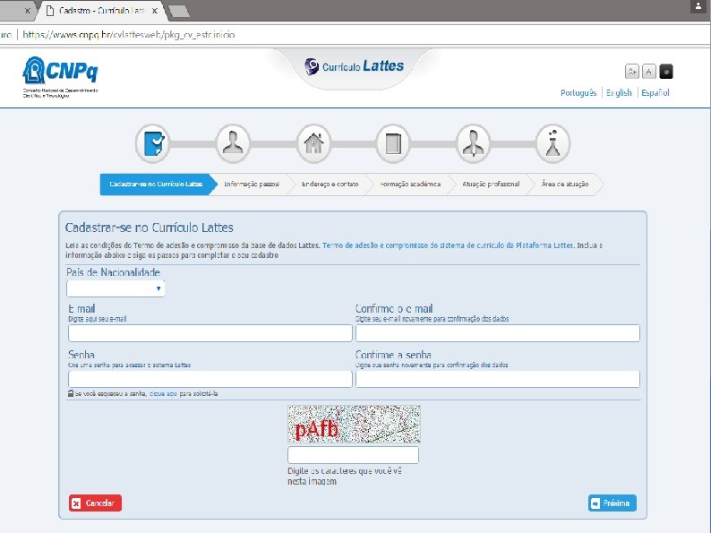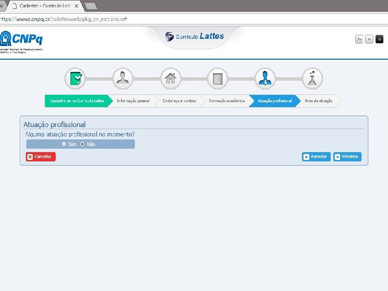 Após preenchido todo o formulário, na aba Área de Atuação, clicar no botão Próximo. Aparecerá uma caixa de mensagem em que você deverá conferir todos os dados e concordar com o Termo de Adesão/Compromisso com o CNPq e. . . Pronto! O seu currículo estará cadastrado na Plataforma Lattes!
