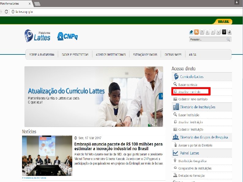 Como atualizar o Currículo Lattes? ● Acesse o site http: //www. lattes. cnpq. br ● Clique na opção Atualizar currículo para atualizar o seu Lattes.