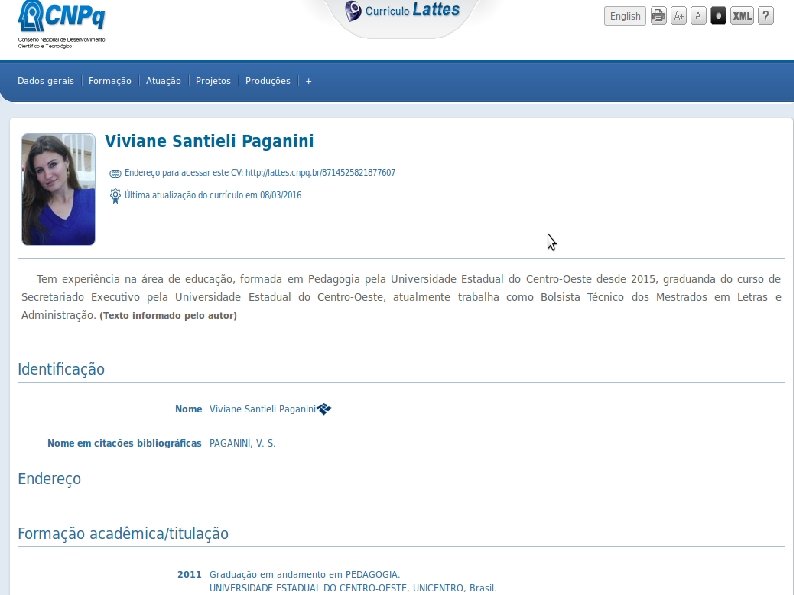 “ Curriculum Lattes é um currículo elaborado nos padrões da Plataforma Lattes, gerida pelo CNPq (Conselho Nacional de Desenvolvimento Científico e Tecnológico). Tornou-se um padrão nacional no registro do percurso acadêmico de estudantes e pesquisadores do Brasil. Atualmente é adotado pela maioria das instituições de fomento, universidades de pesquisa do país. (ROCHA et al. , 2015, e p. institutos 2) ”