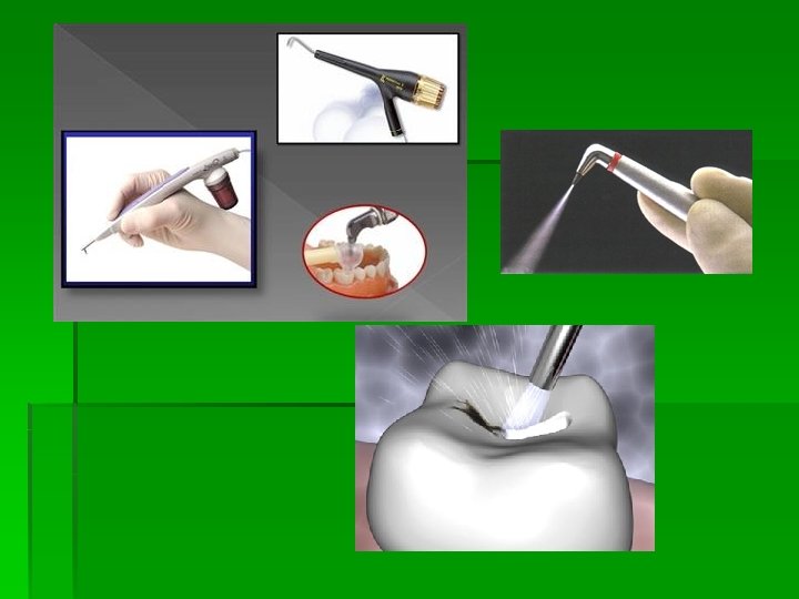 ZRAČNA ABRAZIJA § Terapijski postupak koji se koristi za uklanjanje karijesom zahvaćene strukture zuba i za dijagnozu ranih karijesnih lezija na okluzalnim plohama zuba § Abradira zubnu supstancu pomoći mlaza čestica ALUMINIJEVA OKSIDA, UGLJIKOVA OKSIDA ILI DUŠIKOVA PLINA izbačenoh velikom brzinom pomoću stlačenog zraka