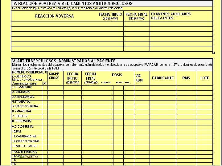 MINISTERIO DE SALUD DIGEMID-DEAUM DGSP-ESNP Y CTB FICHA DE REPORTE DE SOSPECHA DE REACCIONES ADVERSAS A MEDICAMENTOS ANTITUBERCULOSOS Norma Técnica de Salud para el Control de la Tuberculosis. RM Nº 383 -2006 MINSA (25 abr-06)