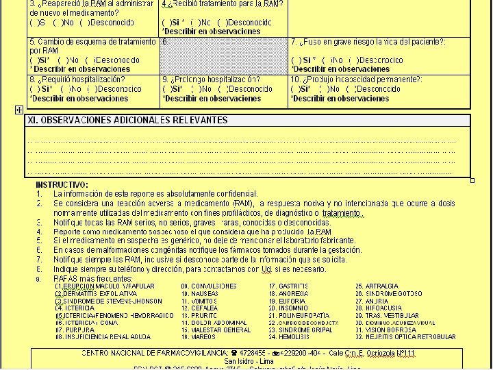 Sistema Peruano de Farmacovigilancia n. Sistema de Notificación Espontánea n. Hoja Amarilla (profesionales/empresas) n. Base de Datos n. Sistema de Vigilancia Hospitalaria n. Implementación de la FCVG. en Hospitales de Lima y Provincia n Sistema de vigilancia a los medicamentos de las estrategias sanitarias nacionales: Malaria, VIH, TBC n. Medicamentos antimaláricos n. Medicamentos antirretrovirales n. Medicamentos antituberculosos