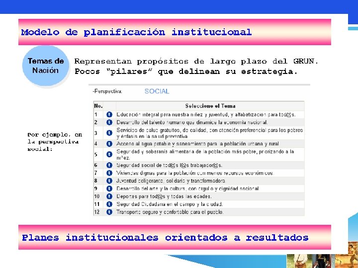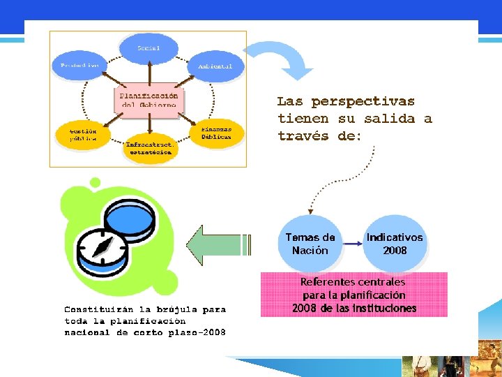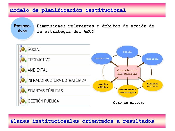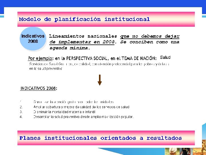 Modelo de Plan Institucional Perspectiva Temas de Nación Marco de Referencia para la Planificación Nacional Indicativos 2008 Recursos Objetivos Institucionales Operatividad Presupuesto Articulado a estrategias Indicadores / Metas Planes Institucionales Norte / orientación, que empalme con PDHN Acciones 2008 Planes Institucionales Orientados a Resultados