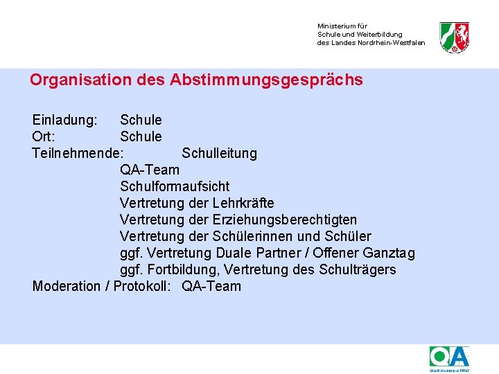 Ministerium für Schule und Weiterbildung des Landes Nordrhein-Westfalen Organisation des Abstimmungsgesprächs Einladung: Schule Ort: Schule Teilnehmende: Schulleitung QA-Team Schulformaufsicht Vertretung der Lehrkräfte Vertretung der Erziehungsberechtigten Vertretung der Schülerinnen und Schüler ggf. Vertretung Duale Partner / Offener Ganztag ggf. Fortbildung, Vertretung des Schulträgers Moderation / Protokoll: QA-Team