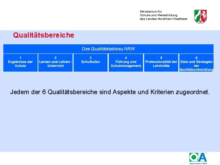 Ministerium für Schule und Weiterbildung des Landes Nordrhein-Westfalen Qualitätsbereiche Jedem der 6 Qualitätsbereiche sind Aspekte und Kriterien zugeordnet.