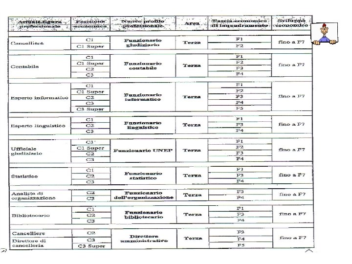 I profili professionali dell’Amministrazione Giudiziaria Nella prima area è previsto un solo profilo professionale: Ausiliario. Nella seconda area sono previsti nove profili professionali diversificati per specifiche professionali, fasce economiche di accesso e titoli di studio richiesti per l’accesso dall’esterno: Conducente di automezzi, Operatore giudiziario, Assistente alla vigilanza dei locali e al servizio automezzi, Assistente giudiziario, Cancelliere, Contabile, Assistente informatico, Assistente linguistico, Ufficiale Giudiziario. Nella terza area sono previsti nove profili professionali diversificati per specifiche professionali, fasce economiche di accesso e titoli di studio richiesti per l’accesso dall’esterno: Funzionario giudiziario, Funzionario contabile, Funzionario informatico, Funzionario linguistico, Funzionario UNEP, Funzionario statistico, Funzionario dell’organizzazione, Funzionario bibliotecario, Direttore amministrativo.