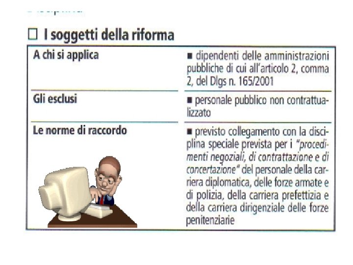 Restano esclusi i lavoratori della Pubblica Amministrazione in regime di diritto pubblico: • Magistrati ordinari, amministrativi e contabili • Avvocati dello Stato • Personale militare e Polizia di Stato • Personale della carriera diplomatica e prefettizia • Corpo nazionale dei vigili del fuoco • Dirigenti penitenziari • Docenti universitari
