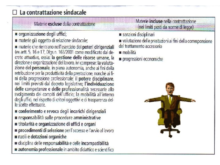 Contrattazione collettiva Il processo di privatizzazione del rapporto del lavoro iniziato con il D. lvo 29/93 aveva subito una forte accelerazione con la legge 59/97 e con i successivi decreti delegati riconducendo alla disciplina negoziale ( CONTRATTAZIONE, ex art. 2 c 3 D. lvo 165/01 ) tutti gli istituti del rapporto di lavoro demandati a tale fonte al fine di qualificare l’offerta dei servizi attraverso la piena valorizzazione delle risorse. Le trattative sono svolte dalla Agenzia per la rappresentanza Negoziale delle PP. AA (ARAN) per la parte pubblica, e le OO. SS. Individuate secondo i criteri di cui all’art. 47 bis D. Lvo 29/93 per la parte sindacale