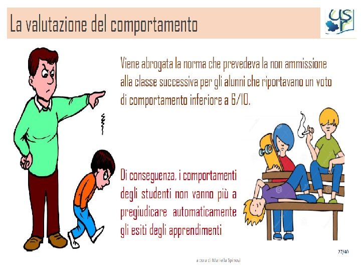Considerazioni finali • Il voto (soprattutto quello in condotta) e la bocciatura vengono spesso considerati indici di serietà della scuola e/o strumenti indispensabili per spronare all’impegno di molti ragazzi. • Tuttavia gli studiosi ci ricordano che un apprendimento duraturo non è quello stimolato dal voto, bensì dalla curiosità per ciò che si studia, dalla percezione di diventare competenti, dalla capacità di padroneggiare con successo un