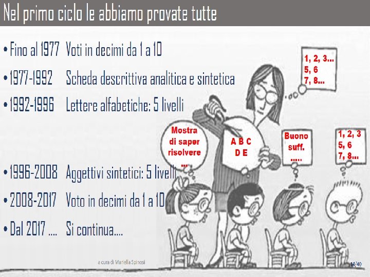Considerazioni finali • Cosa significa un “sei”? E cosa un “sei” in matematica? E il “sei” dell’insegnante A è identico al “sei” del docente B? • I voti finiscono col diventare sintomo di un superficiale appagamento, quando non veicolo di competizione tra i ragazzi o fonte di contenzioso tra genitori e