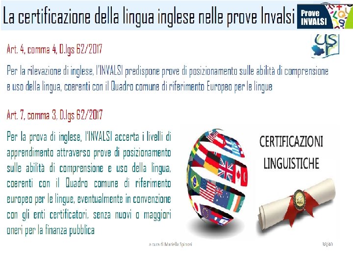 Gli attuali riferimenti normativi • Legge 107. Riforma del sistema nazionale di istruzione e formazione e delega per il riordino delle disposizioni legislative vigenti. • D. Lgs. 62 del 13/4/2017. Norme in materia di valutazione e certificazione delle competenze nel primo ciclo di istruzione e esami di stato. • D. M. 741 del 3/10/2017 che regolamenta l’esame di stato conclusivo del primo ciclo di istruzione • D. M. 742 del 3/10/2017 che Regolamenta le modalità per la certificazione delle competenze. • Circolare MIUR 1865 10/10/2017. Indicazioni in