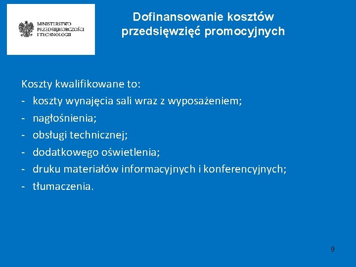 Dofinansowanie kosztów przedsięwzięć promocyjnych Rozporządzenie Rady Ministrów z dnia 4 listopada 2014 r. w sprawie udzielania pomocy de minimis na realizację niektórych przedsięwzięć w zakresie promocji i wspierania eksportu lub sprzedaży na rynku wewnętrznym Unii Europejskiej (Dz. U. 2014, poz. 1569). Dofinansowanie kosztów organizacji: – konferencji, seminariów. Refundacja obejmuje do 50% kosztów realizacji danego przedsięwzięcia. 8
