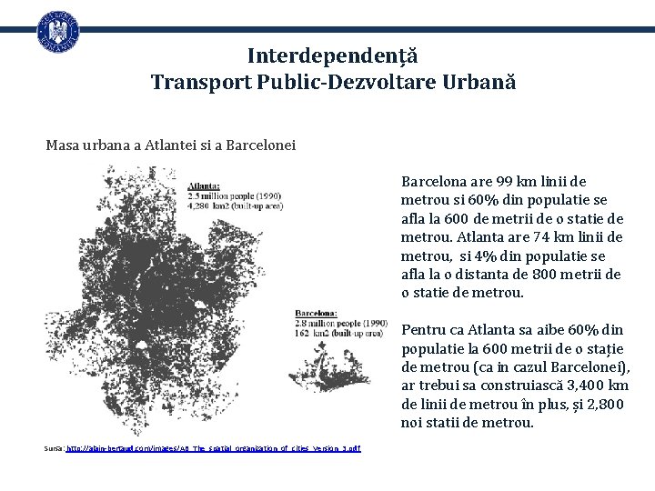 Interdependență Transport Public-Dezvoltare Urbană Masa urbana a Atlantei si a Barcelonei Barcelona are 99 km linii de metrou si 60% din populatie se afla la 600 de metrii de o statie de metrou. Atlanta are 74 km linii de metrou, si 4% din populatie se afla la o distanta de 800 metrii de o statie de metrou. Pentru ca Atlanta sa aibe 60% din populatie la 600 metrii de o stație de metrou (ca in cazul Barcelonei), ar trebui sa construiască 3, 400 km de linii de metrou în plus, și 2, 800 noi statii de metrou. Sursa: http: //alain-bertaud. com/images/AB_The_spatial_organization_of_cities_Version_3. pdf