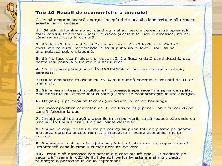 Ziua 3, 4, 5 Obiective operaționale Activități de învățare O 1 Elevii vor realiza niște calcule Alege în care vor prezenta date reale despre situația ecologica Caută a lumii O 3 Vor rezolva probleme iar datele le vor fixa in tabele Demersul elevului rezolvă O 2 O 4 O 5 Lecturarea unui text cu conținut civic despre economisirea resurselor Citește Discuții despre comportamentul unor oameni care risipesc sau economisesc resursele naturale Discută Află