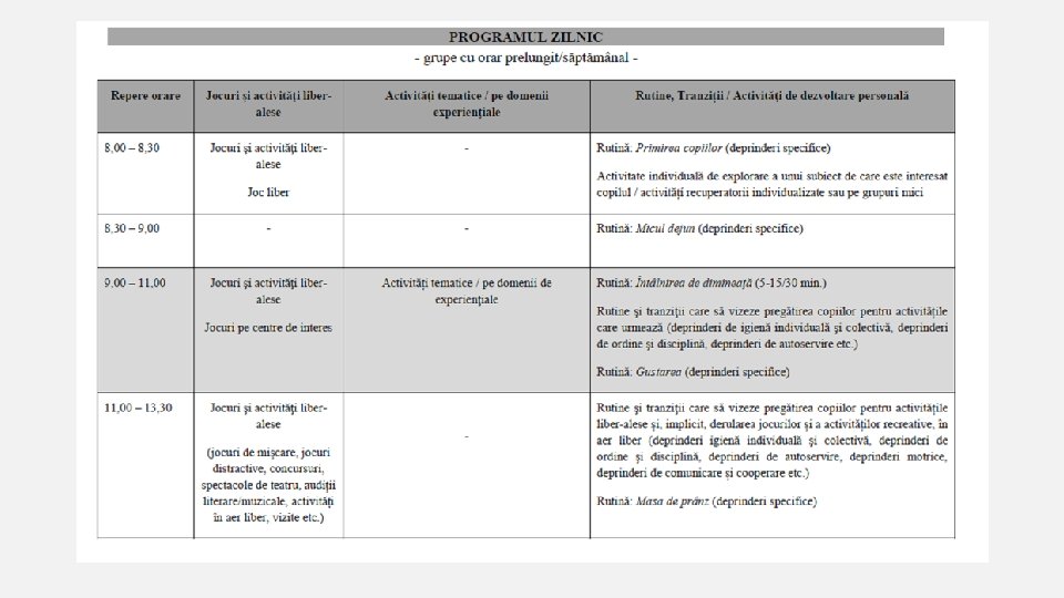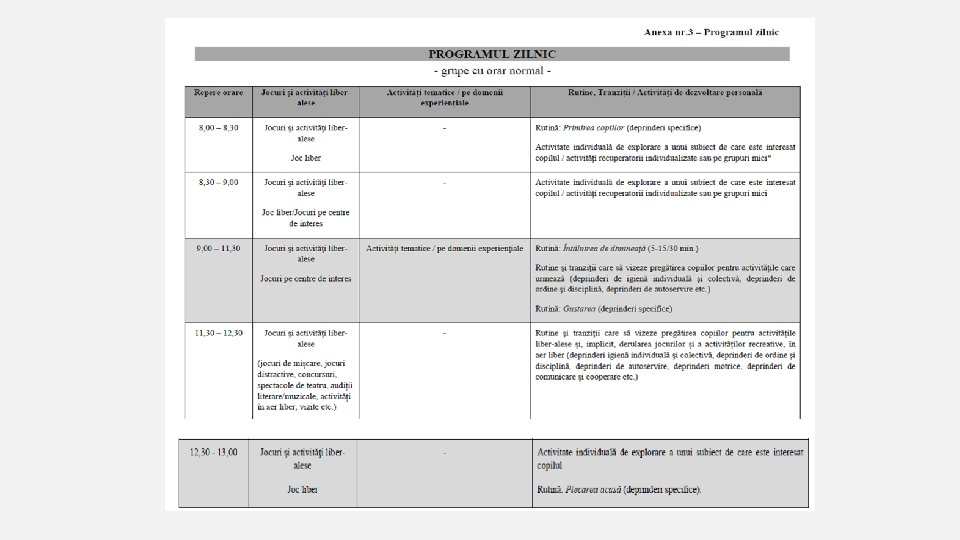 IMPORTANT! • În documentul „Curriculum 2018 - final” care va fi postat pe site-ul www. isjbacău. ro, compartiment curricuculum- educație timpurie, veți găsi detaliate modalitățile de desfășurare a programului zilnic și al activităților din grădinița de copii, precum și documente necesare la grupă: • - Profilul de formare al copilului care finalizează învățământul preșcolar • - Notă privind planul de învățământ • - Metodologia de aplicare a Planului de învățământ pentru educația timpurie • - Programa pentru educația timpurie – structura curriculară și modelul de proiectare curriculară promovat • - Domeniile de dezvoltare- detaliere • - Schema proiectării, pe teme anuale de studiu, a activităților tematice/pe domenii experiențiale • - PRECIZĂRI privind conținutul temelor anuale de studiu și modul în care fiecare dintre acestea poate fi abordată • - Anexa nr. 2 – Condica de evidență a activității didactice din educația timpurie • - Anexa nr. 4 – Fișa de apreciere a progresului individual al copilului înainte de înscrierea în clasa pregatitoare • - Anexa nr. 5 – Repere proiect didactic (activitate integrată) • - Anexa nr. 6 - Proiect tematic