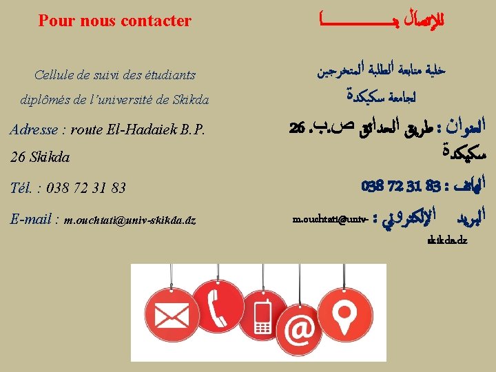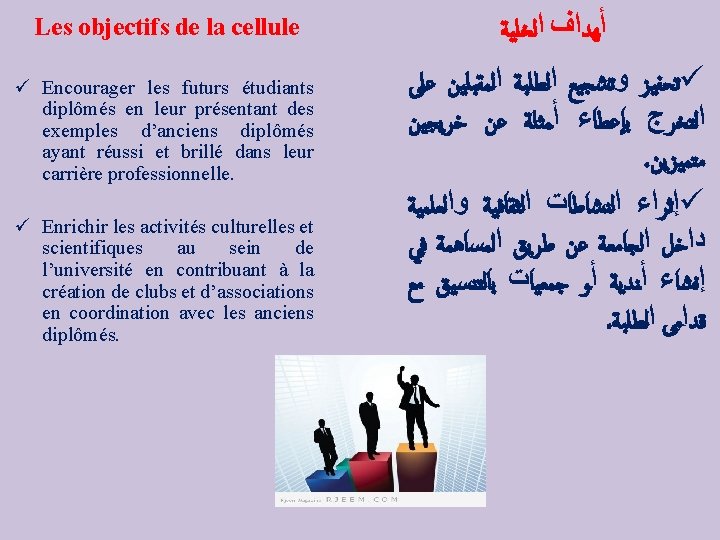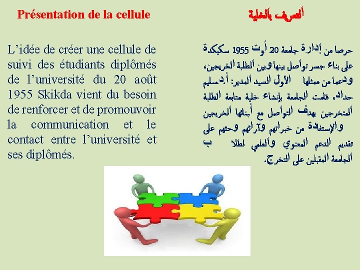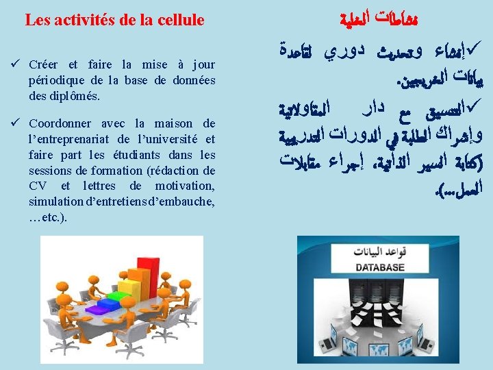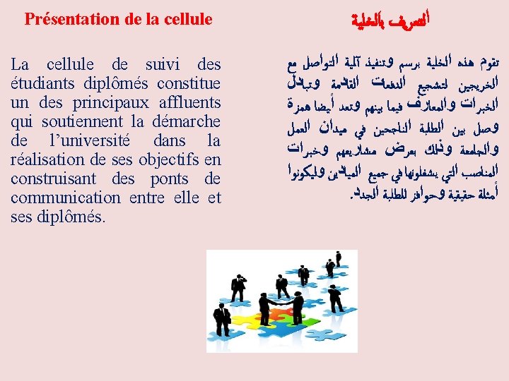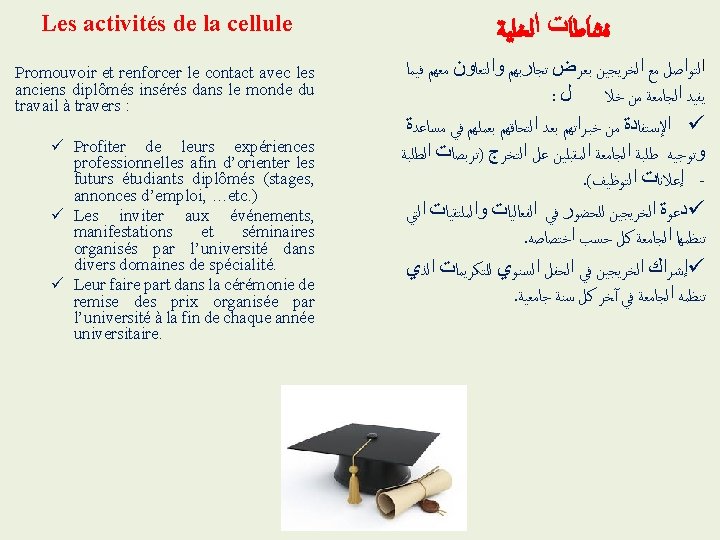 Les objectifs de la cellule ﺃﻬﺪﺍﻑ ﺍﻟﺨﻠﻴﺔ ü Créer un canal efficace de communication entre les diplômés et l’université en renforçant les moyens de communication entre l’étudiant diplômé et l’université. ﺑﻨﺎﺀ ﻗﻨﺎﺓ ﺍﺗﺼﺎﻝ ﻓﻌﺎﻟﺔ ﺑﻴﻦ ﺍﻟﺨﺮﻳﺠﻴﻦ ü. ﻭﺍﻟﺠﺎﻣﻌﺔ ü Contribuer à la réhabilitation des nouveaux diplômés pour leur insertion dans le monde professionnel. ﺍﻟﻤﺴﺎﻫﻤﺔ ﻓﻲ ﺗﺄﻬﻴﻞ ﺍﻟﺨﺮﻳﺠﻴﻦ ﺍﻟﺠﺪﺩ ü. ﻟﻺﻧﺨﺮﺍﻁ ﻓﻲ ﻋﺎﻟﻢ ﺍﻟﺸﻐﻞ